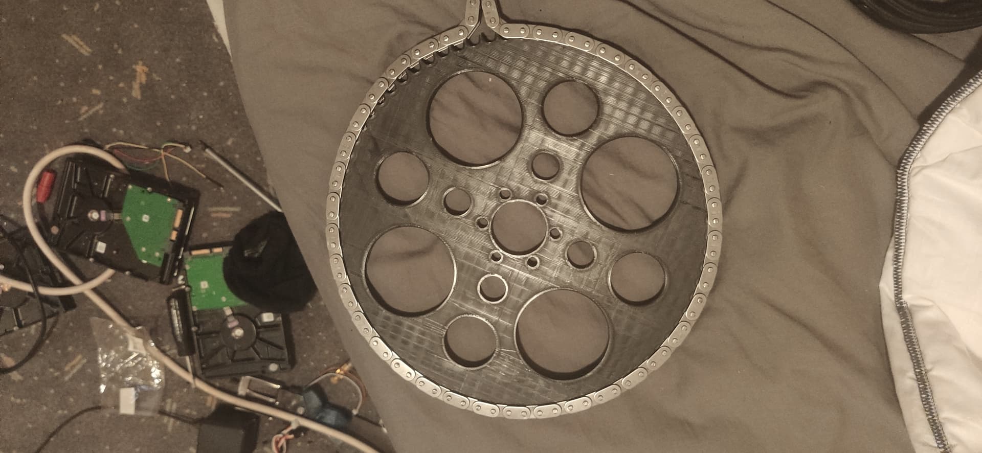 - Design de la couronne et du pignon puis découpage laser dans du 5mm. Traitement thermique pour le pignon (a l’huile de vidange).
