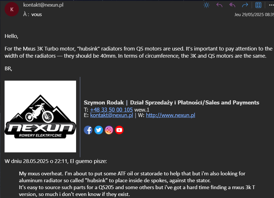 Je parle d’une surchauffe moteur. À ce propos j’ai oublié de préciser que j’attends toujours mes radiateurs « hubsink » qui devrait aider mais en soi c’est déjà tout à fait roulable et agréable. Il fait chaud de base et ça n’aide pas.