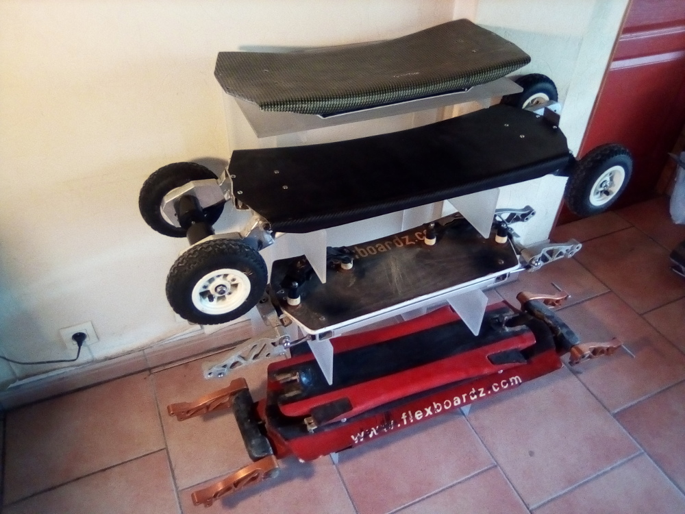 Je reviens avec un peu plus de précision sur ta question à propos du proto qui continue à évoluer : cette planche est un banc d’essai, avec le maximum d’options (cf toutes les positions d’axes de roues, longueur/largeur de plateau, transmission, rtc, etc), sans doute trop…