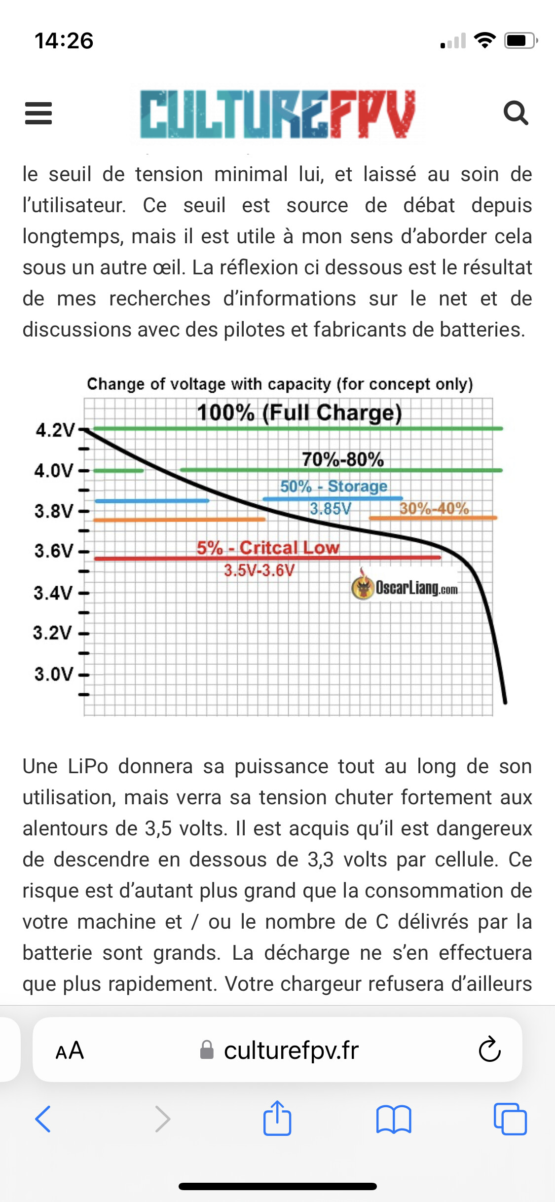 Tunpeux descendre jusqua 3.5V/celll ,mais avec un lipo alert . Ne pas se fier a la tension globale en lipo.