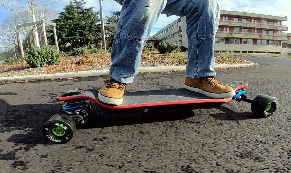 j’ai pu faire un test juste avant le confinement 33 km avec le pack d’origine et 38 km avec le pack additionnel avec les roues de 6 pouces avec à peu prés 50/50 entre chemin et bitume