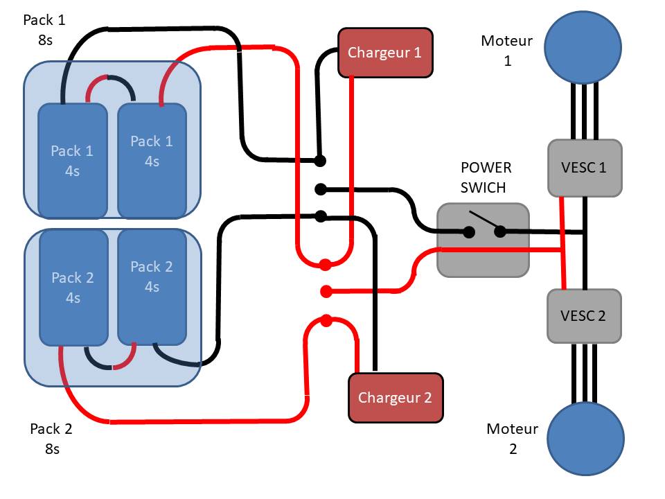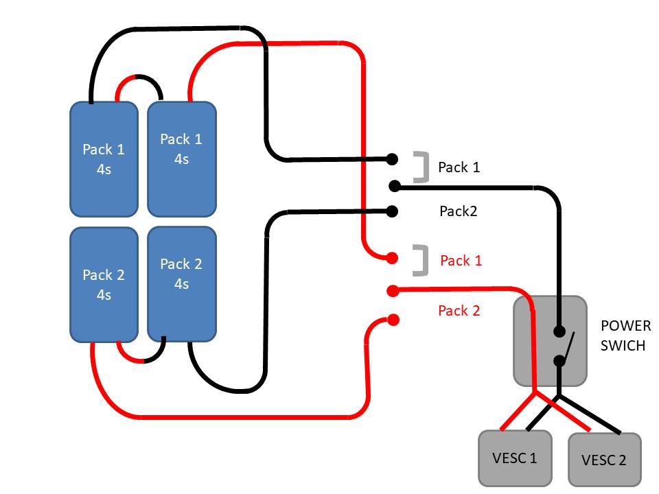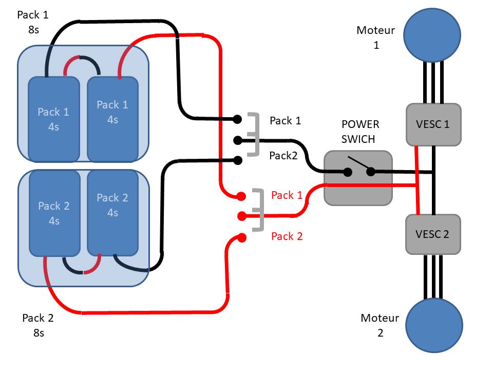 Pourquoi préfères tu utiliser les 2x8S une fois l’un après l’autre et pas les mettre en parallèle? et tu es sûr que ton interrupteur supporteras ce que tu vas lui faire passer à travers? (potentiellement 100A si tu es à fond avec tes 2 VESC.)