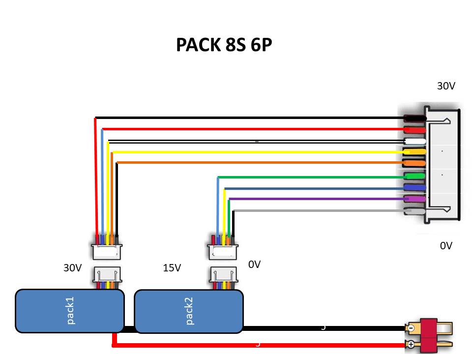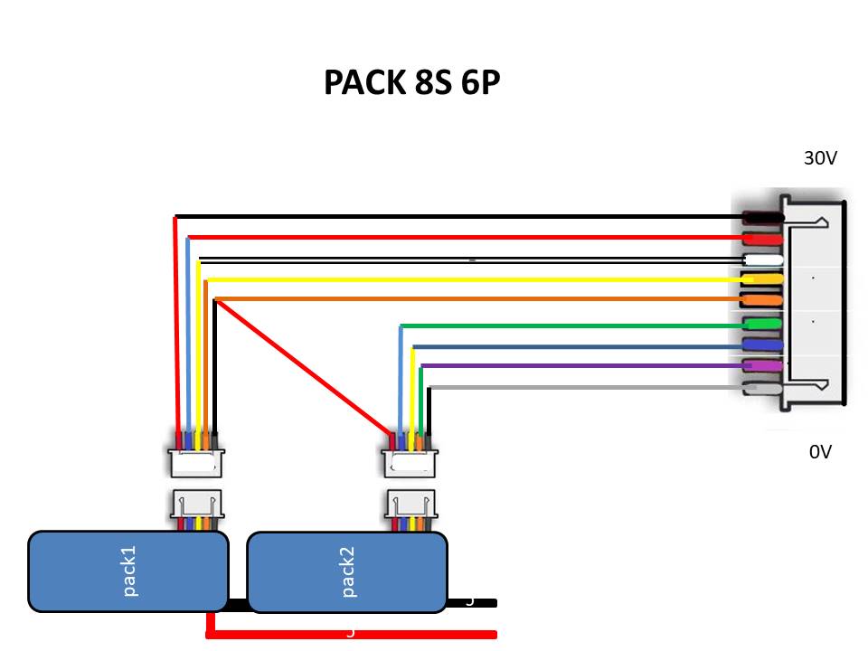 Juste une précision : tu n’est pas obligé de faire la connexion entre les 2 prises équilibrages 4S (le trait rouge en travers) car c’est fait électriquement par la liaison série entre les 2 lipos.