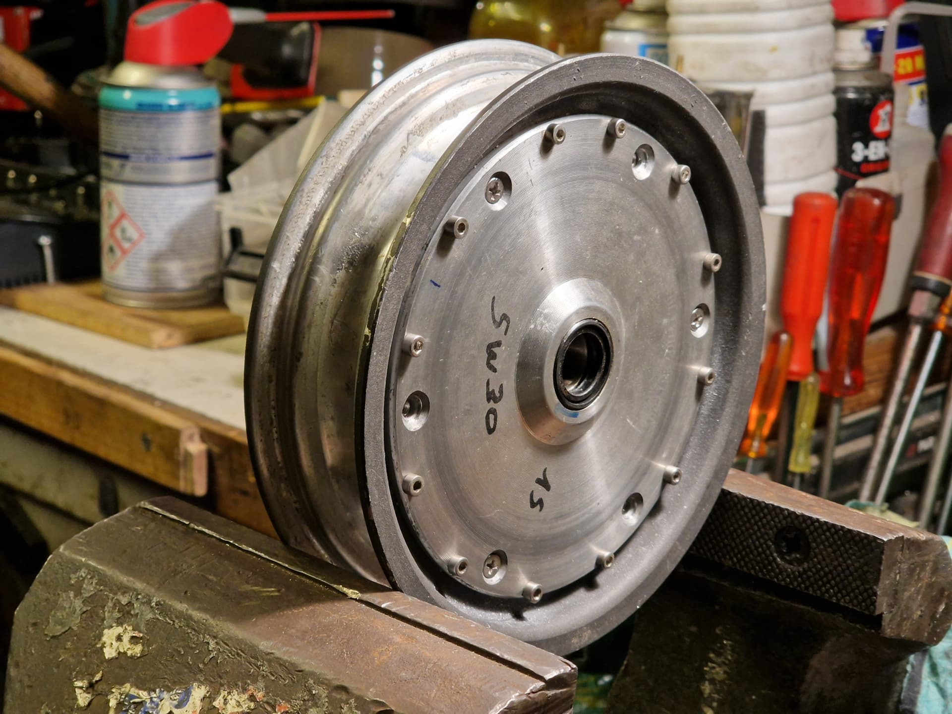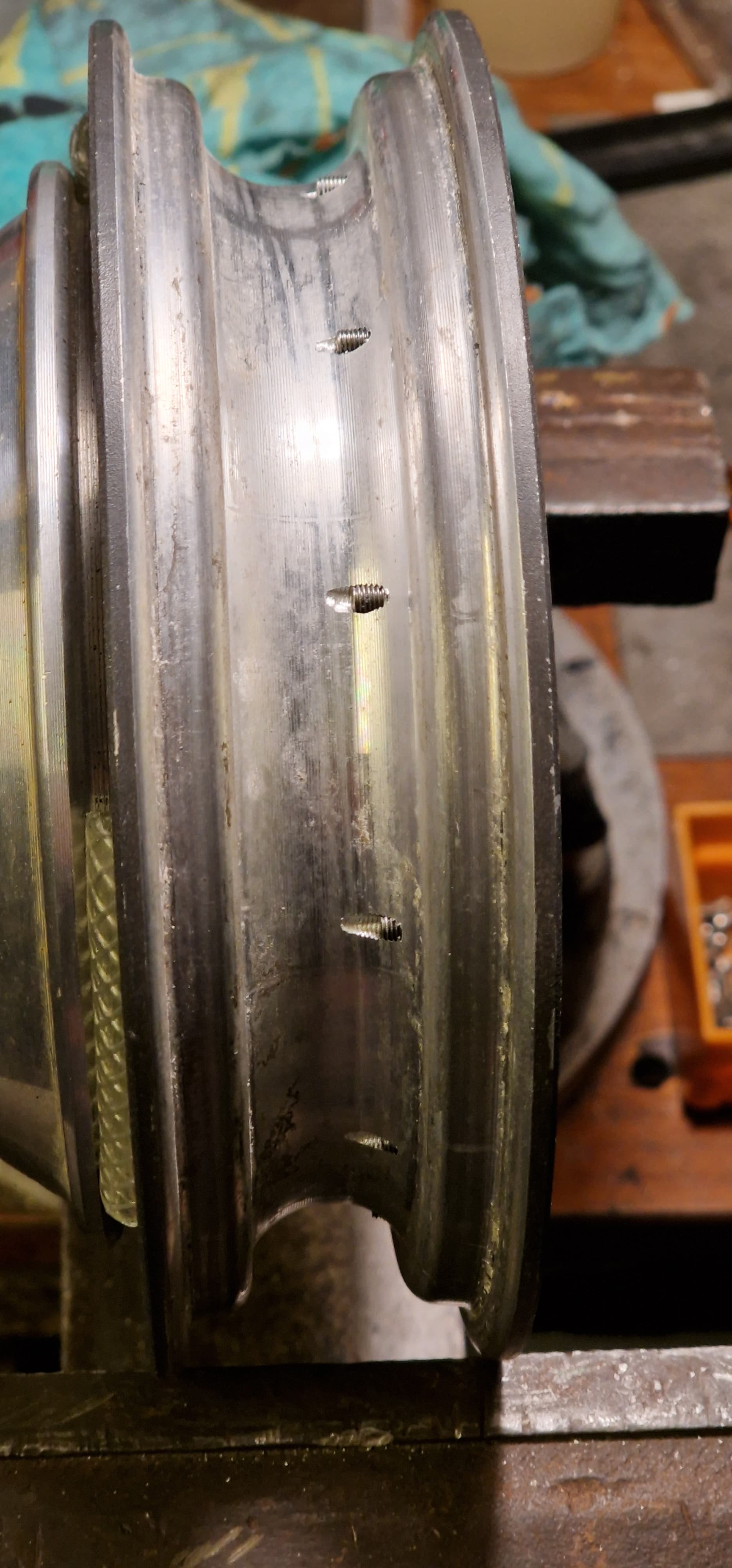 C’est monté. 12 vis btr M3 plus ou moins longues avec du frein filet … quelques meulages de tete de vis et bouchage, et ca fera un.beau fond de jante.![]()