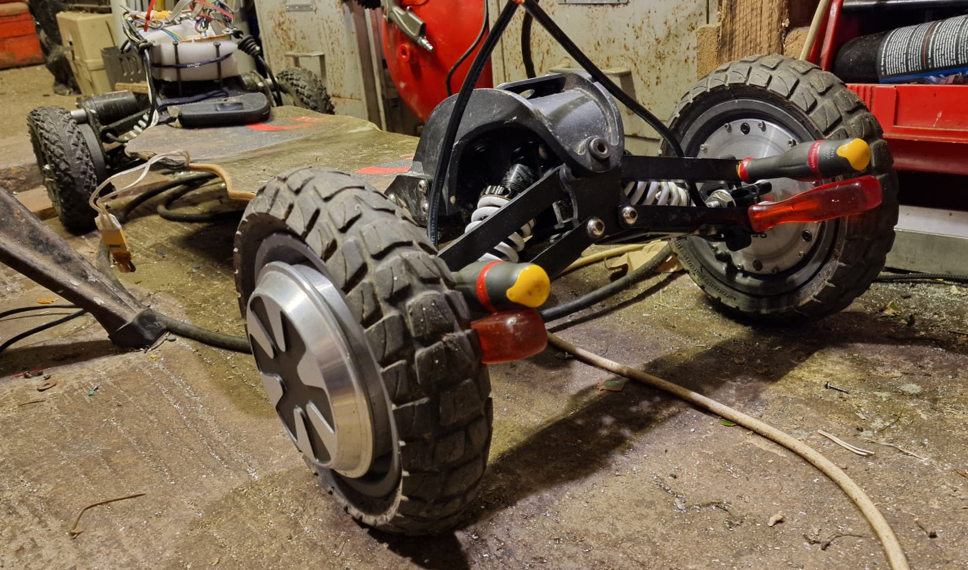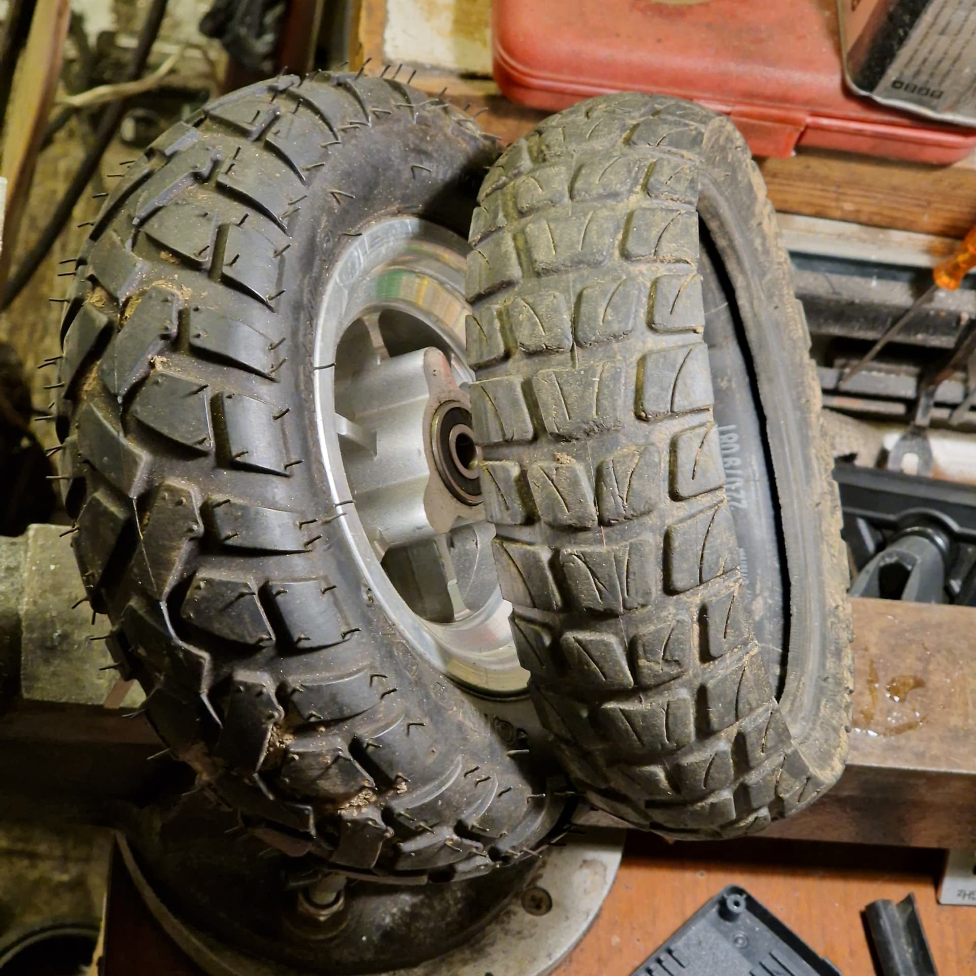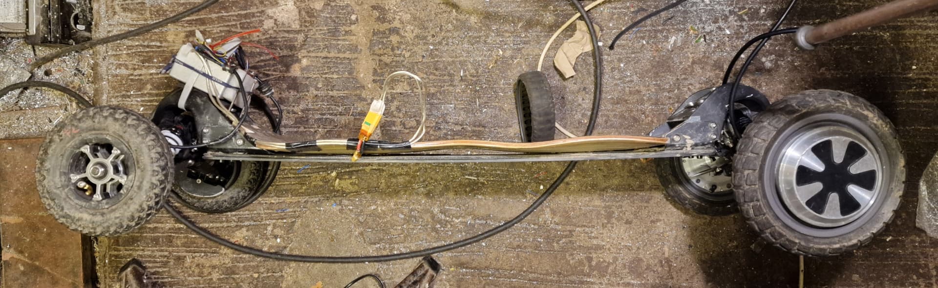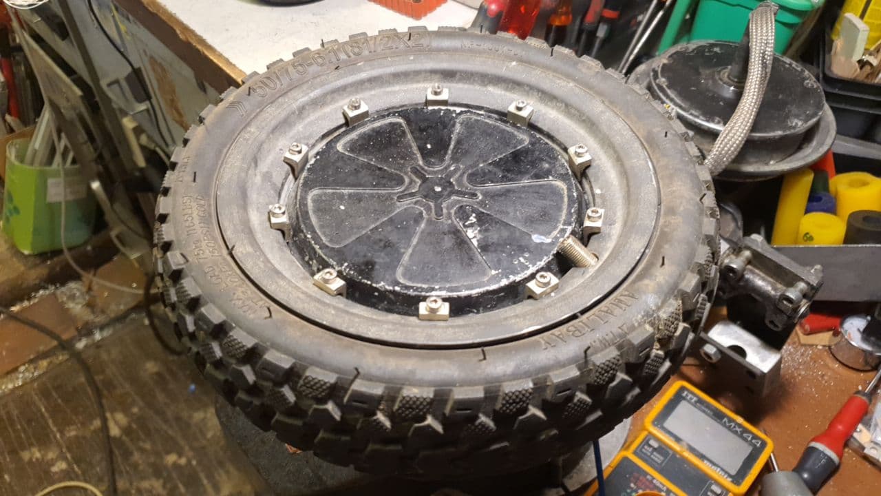 J’aurais pu monter un pneu en 5’’ interne sur le hub , mais le seul sympa pour du TT dans cette cote, c’est du 9x3.50-5 .un peu trop gros a mon gout,et pas necessaire pour un skate amorti. De plus, au dela de 8.5’’ sur les hubs d’hoverboard,on perd en rendement et puissance de freinage . Je préfère les 8.5x3.0 de xiaomi en 6.2’’ interne … donc je bricole…