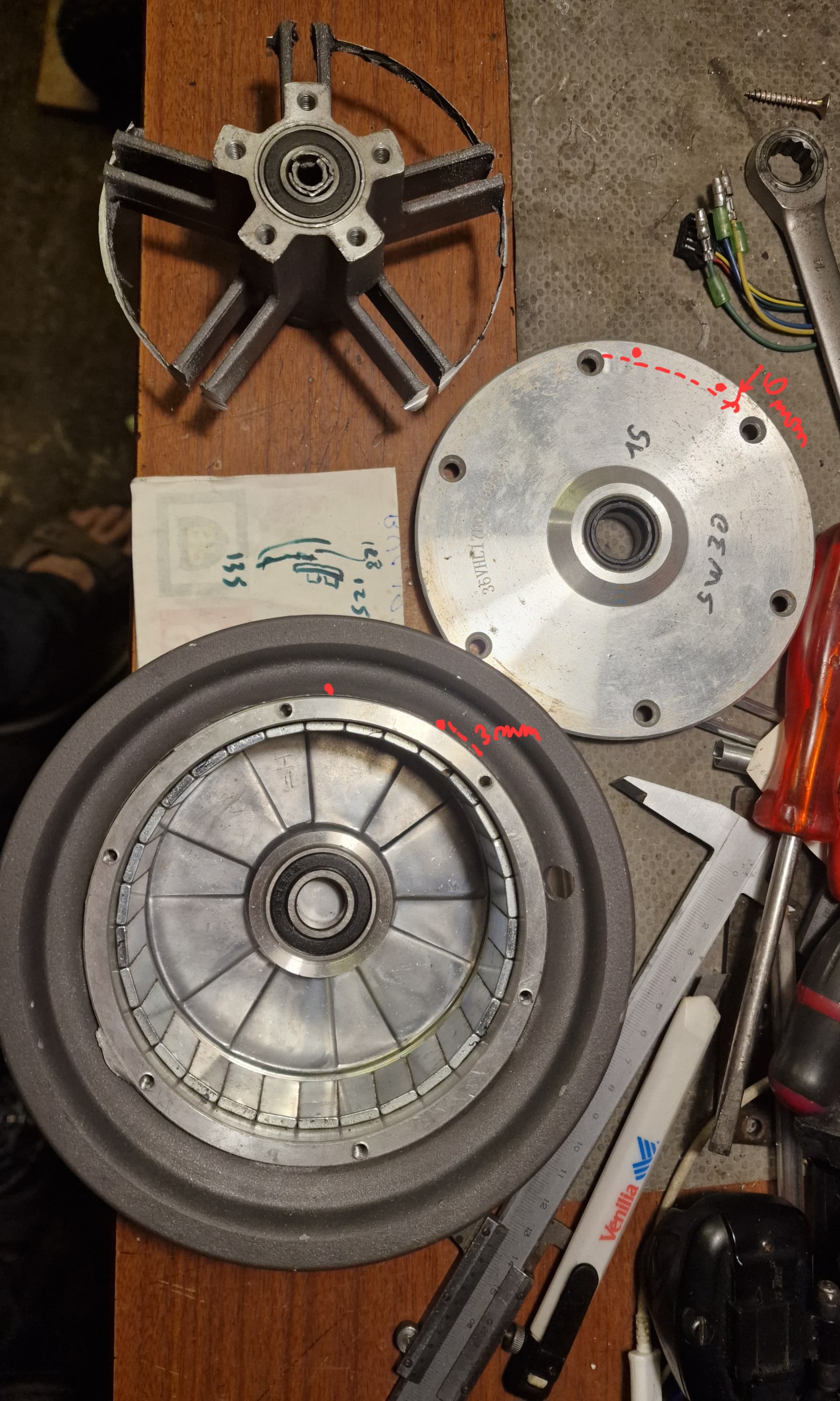 Le mieux aurait été de visser la jante sur le rotor . Mais peu d’épaisseur- difficile a bien tarauder- y’a les aimants derriere. Et jante assez fine a cet endroit.