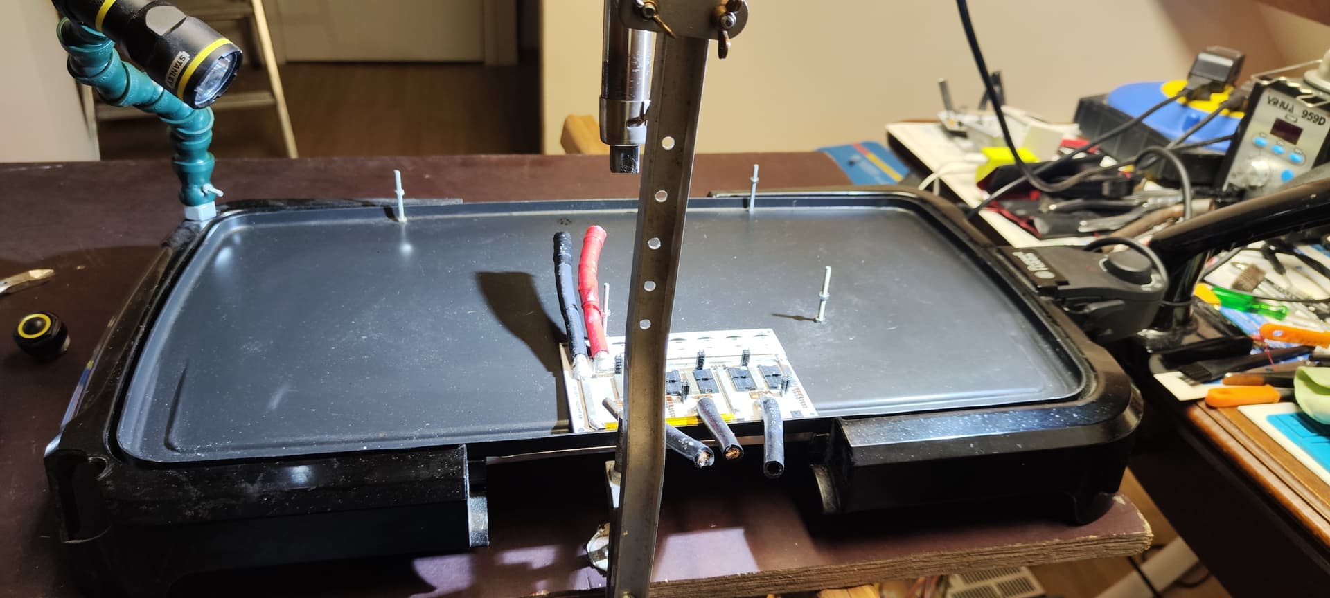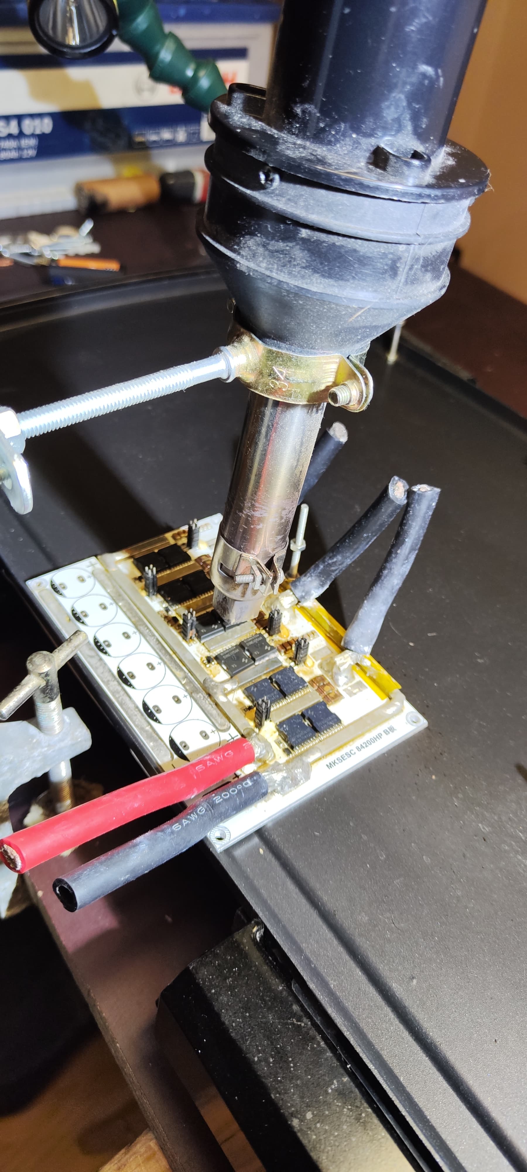 j’ai une station de reflow pour le rebillage, mais ça me saoulais de la sortir. J’ai utilisé une plancha électrique et un pistolet air chaud avec une installation à l’arrache. il faut monter doucement en température pour dessoudé les mosfet. et après il n’y a plus qu’a les attraper avec une pince, s’il n’ont pas fusionné avec le circuit imprimé, là j’ai eu de la chance.