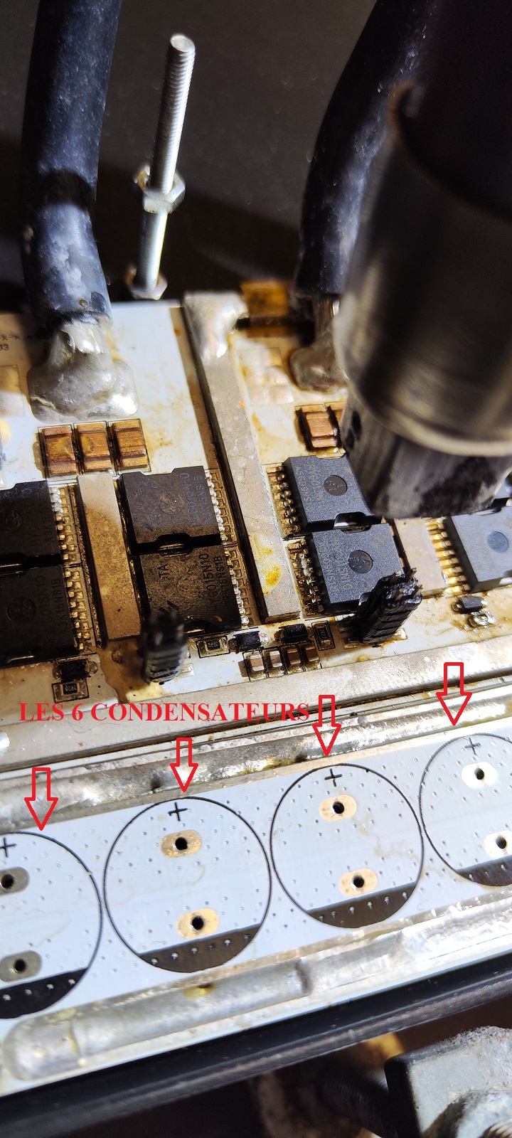 tout d’abord j’ai dessoudé les 6 gros condensateurs, avant qu’ils me pète à la gueule.