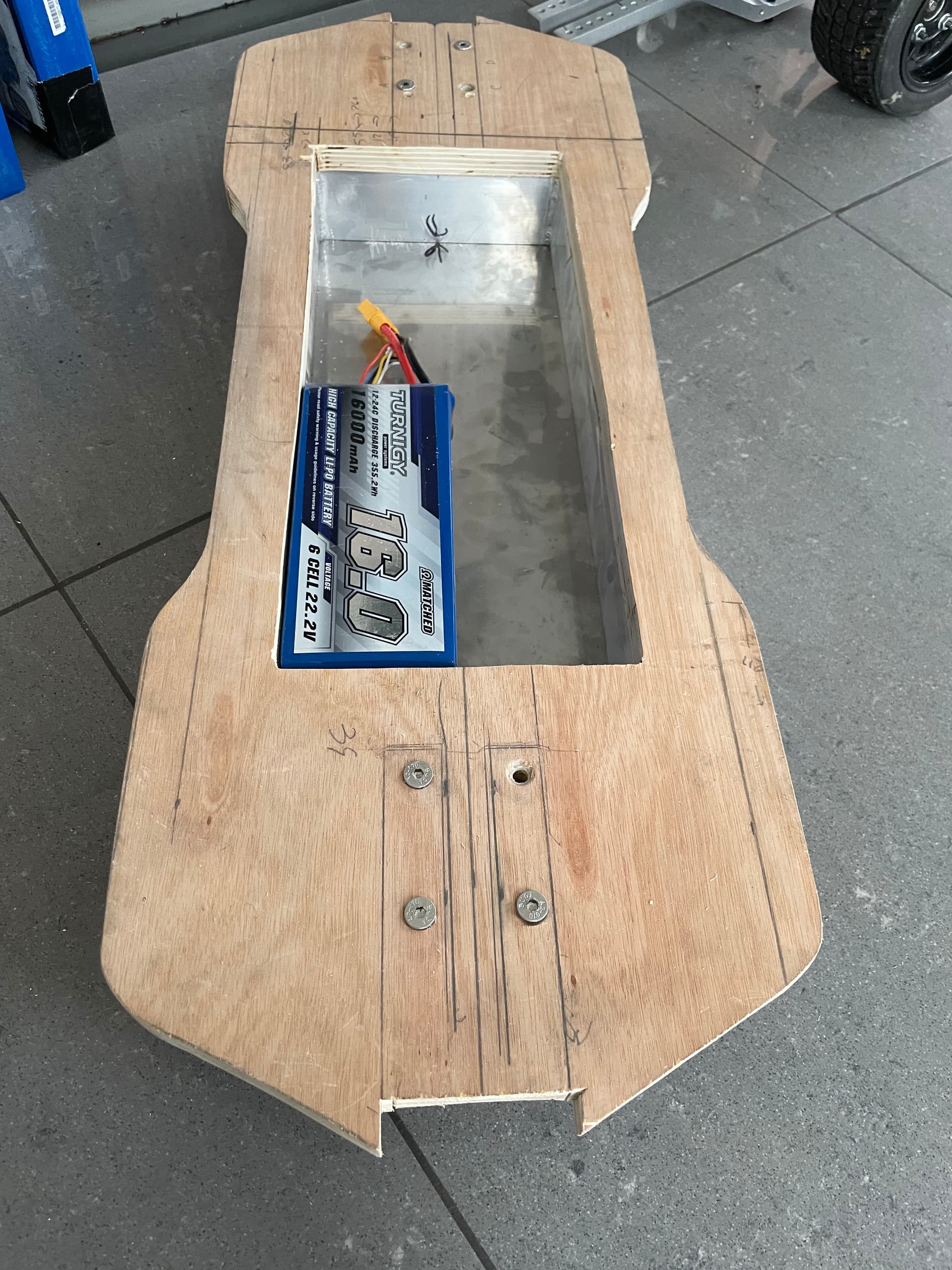 elle abritera les 3 lipo 6S 16Ah une fois la trappe découpée dans le deck et elle confèrera la rigidité (zéro flexion) car même sans trappe découpée le deck en CP de 15 mm flex à mort ….