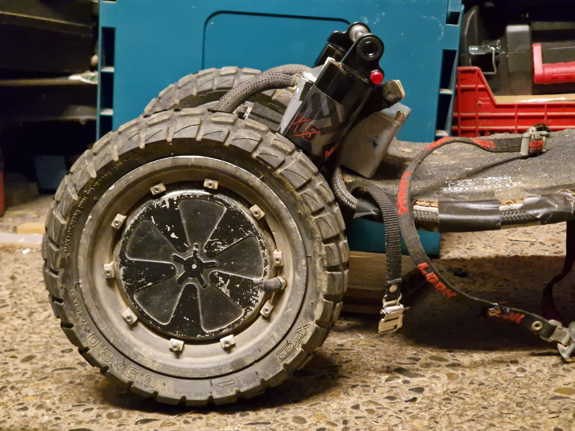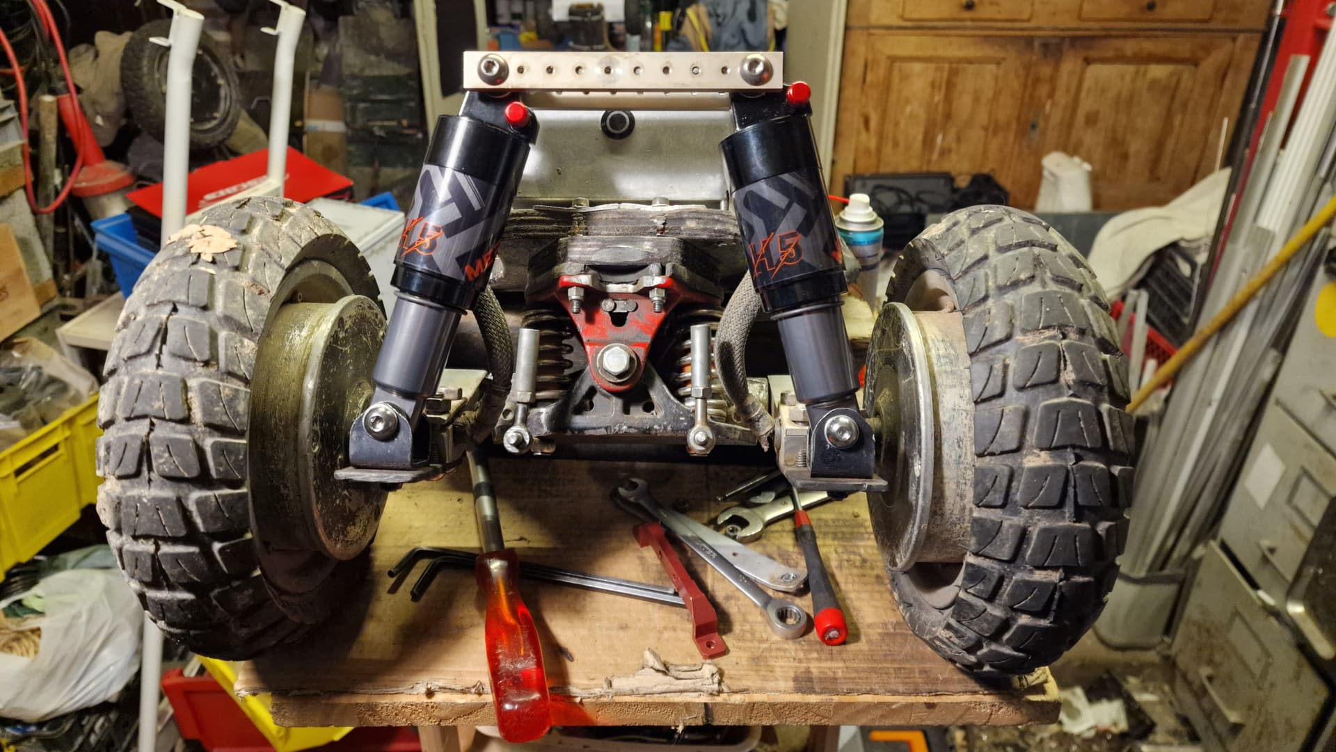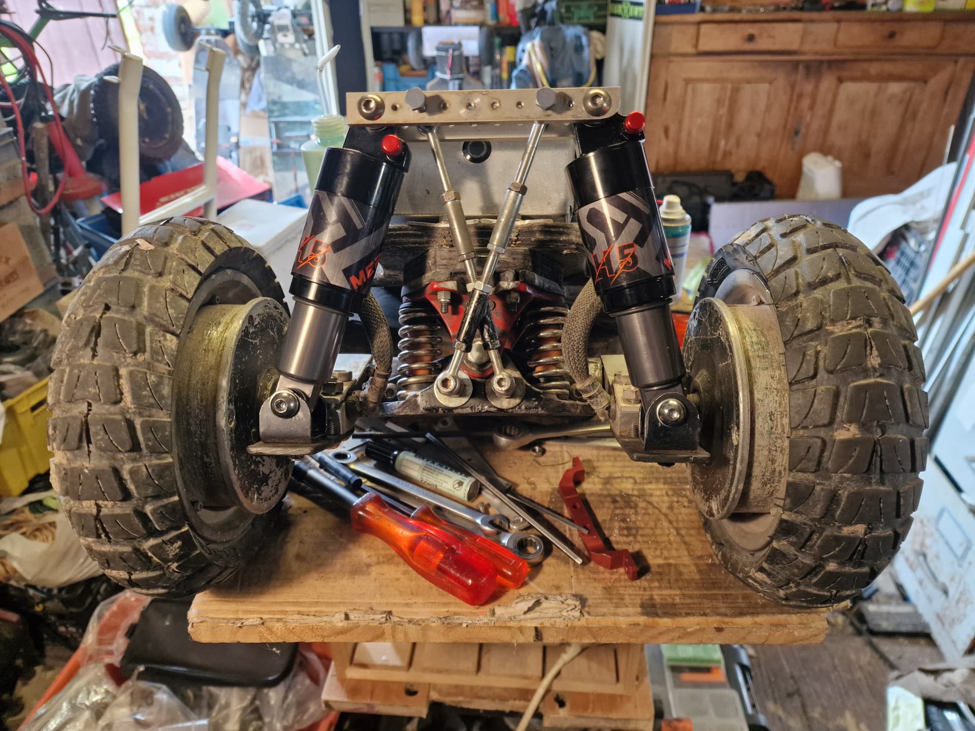 Ça fonctionne pas trop mal , mais débattement très limité, malgré la pression très faible de 0.5~1bar, vu que l’amortisseur est en bout de chaine, apres l’axe de roue.