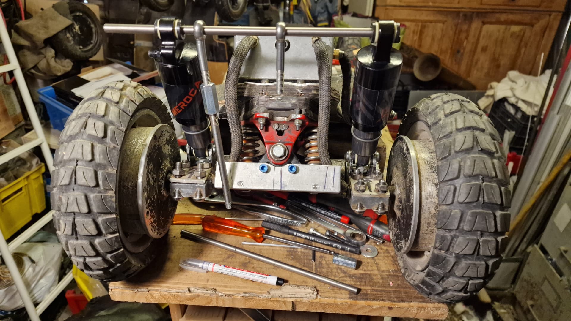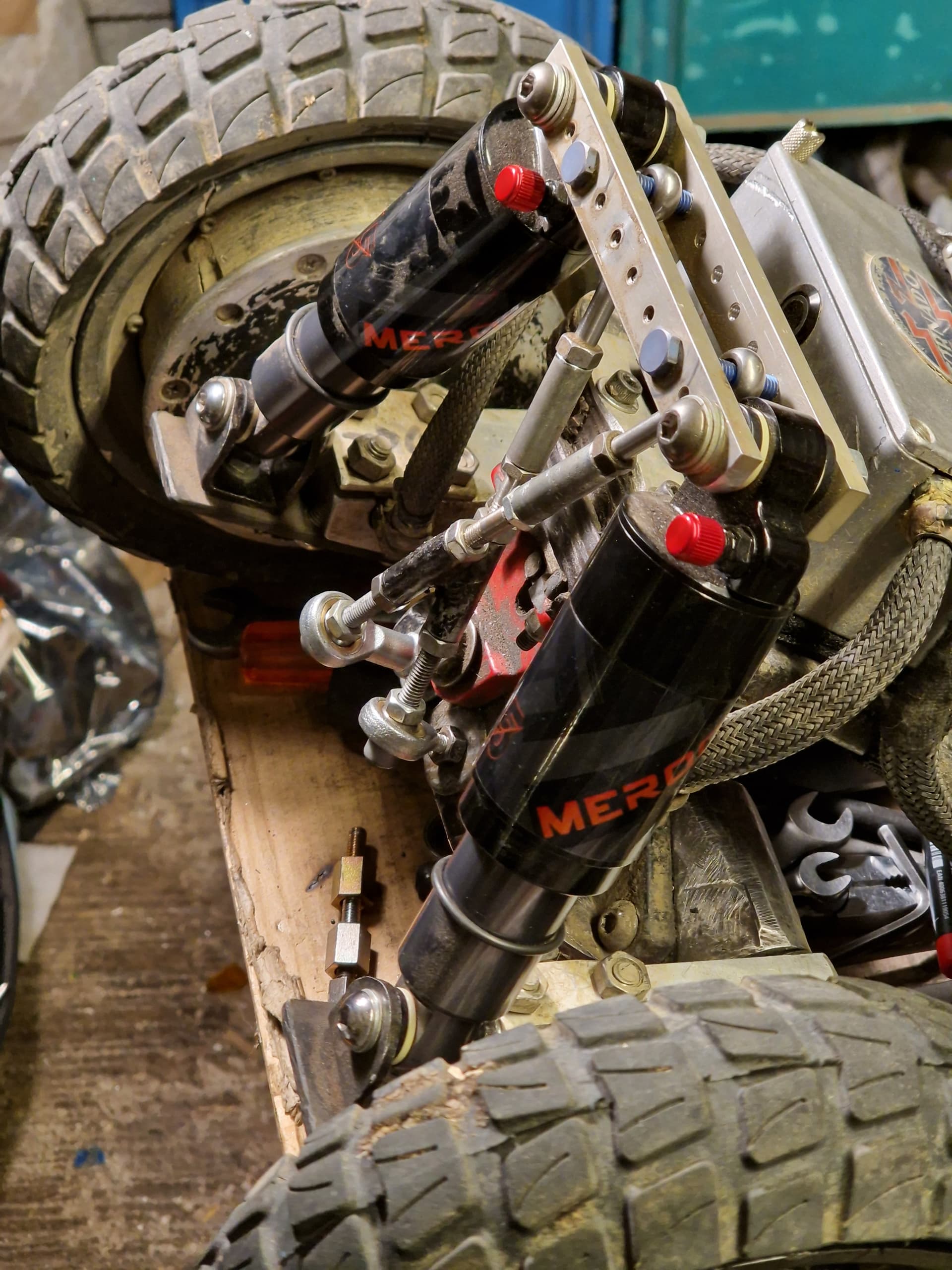 L’idée est intéressante de coupler des amorto et de les coupler façon Moe Stooges à des rotules pour gagner du débattement latéral tout en maintenant de la stabilité mais ce n’est pas une mince affaire . J’espère que t’as des Doliprane…, c’est pas fini!