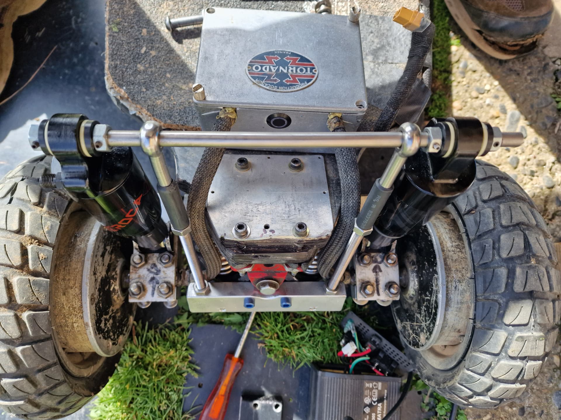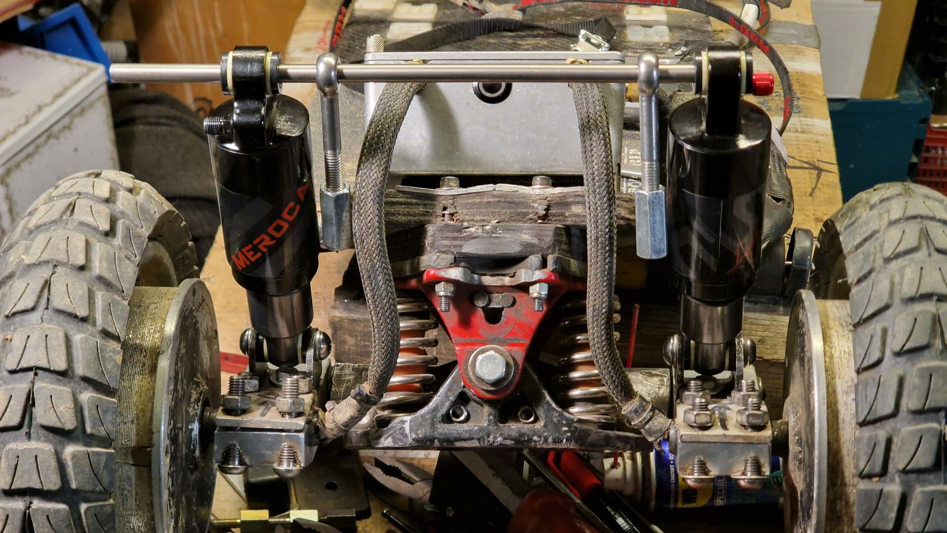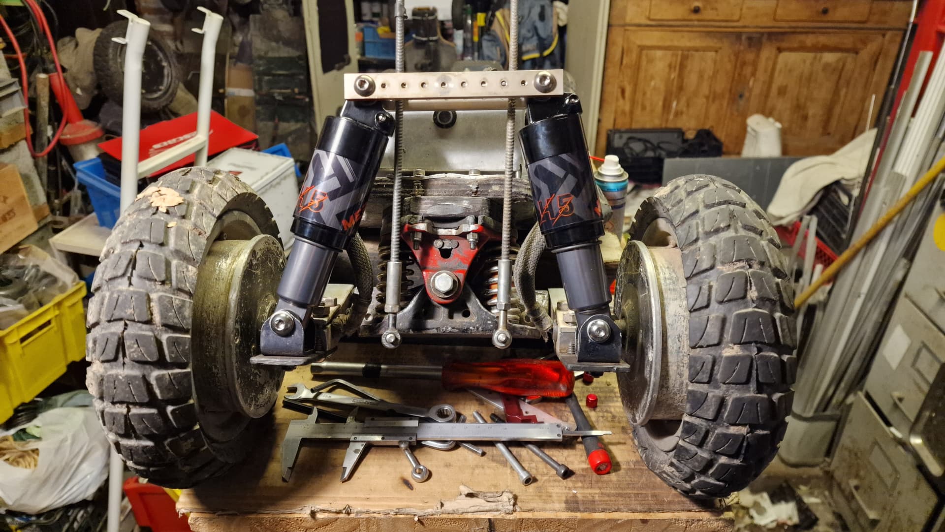 Les amortisseurs ne sont pas fixés de façon optimale pour le moment, il doit en plus y avoir un déséquilibre entre l’amorto droit et le gauche et des contraintes sur le support, c’est complexe ce que tu veux faire, accroche toi…
